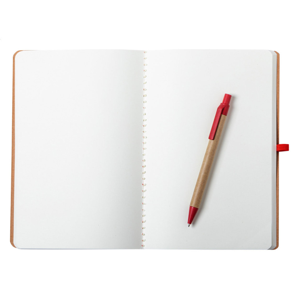 Carnet de notes A5 éco-responsable recouvert de carton recyclé, avec 60 feuilles vierges, un élastique coloré et un stylo à bille en paille de blé. Idéal pour les prises de notes quotidiennes et les réunions professionnelles.