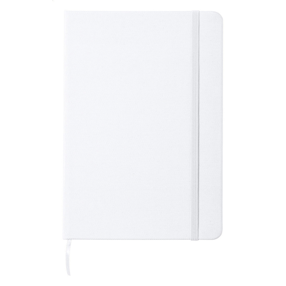 Carnet de notes écologique format A5 recouvert en polyester RPET, doté de 80 feuilles lignées, d'un signet intégré et d'une sangle en caoutchouc pour maintenir le carnet fermé. Idéal pour les prises de notes professionnelles et les réunions.