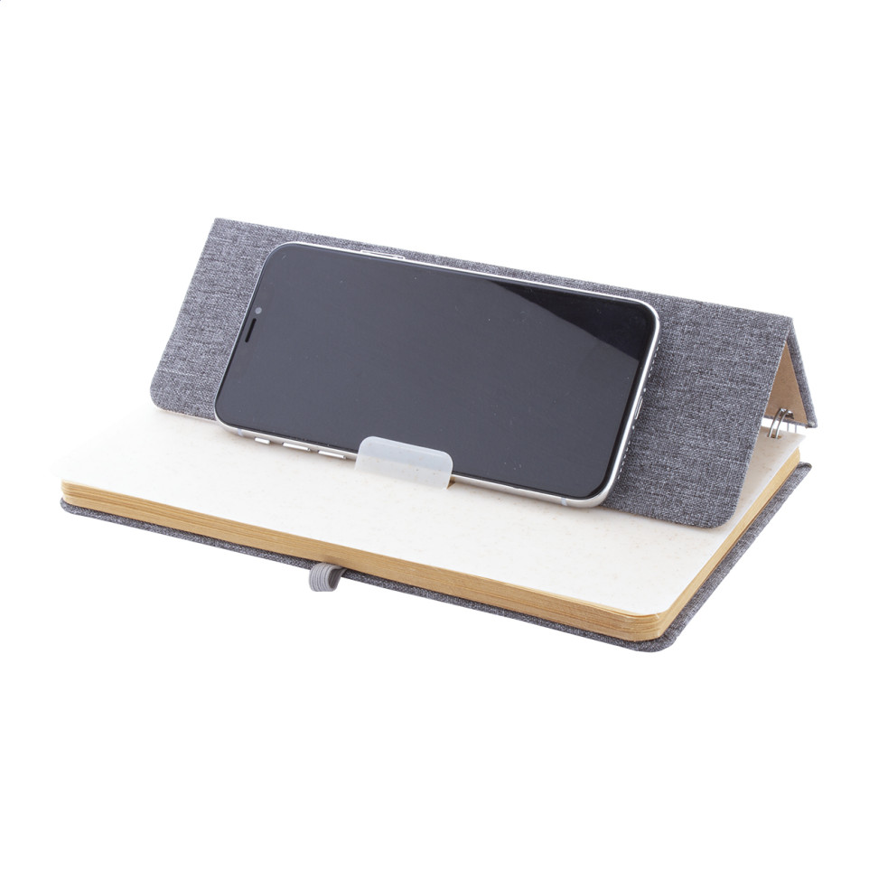 Le carnet de notes Holbook gris est un cahier à spirales format A5 recouvert de polyester RPET écologique, doté d'un insert pratique en paille de blé pour accueillir votre smartphone et tablette pendant vos sessions de travail.