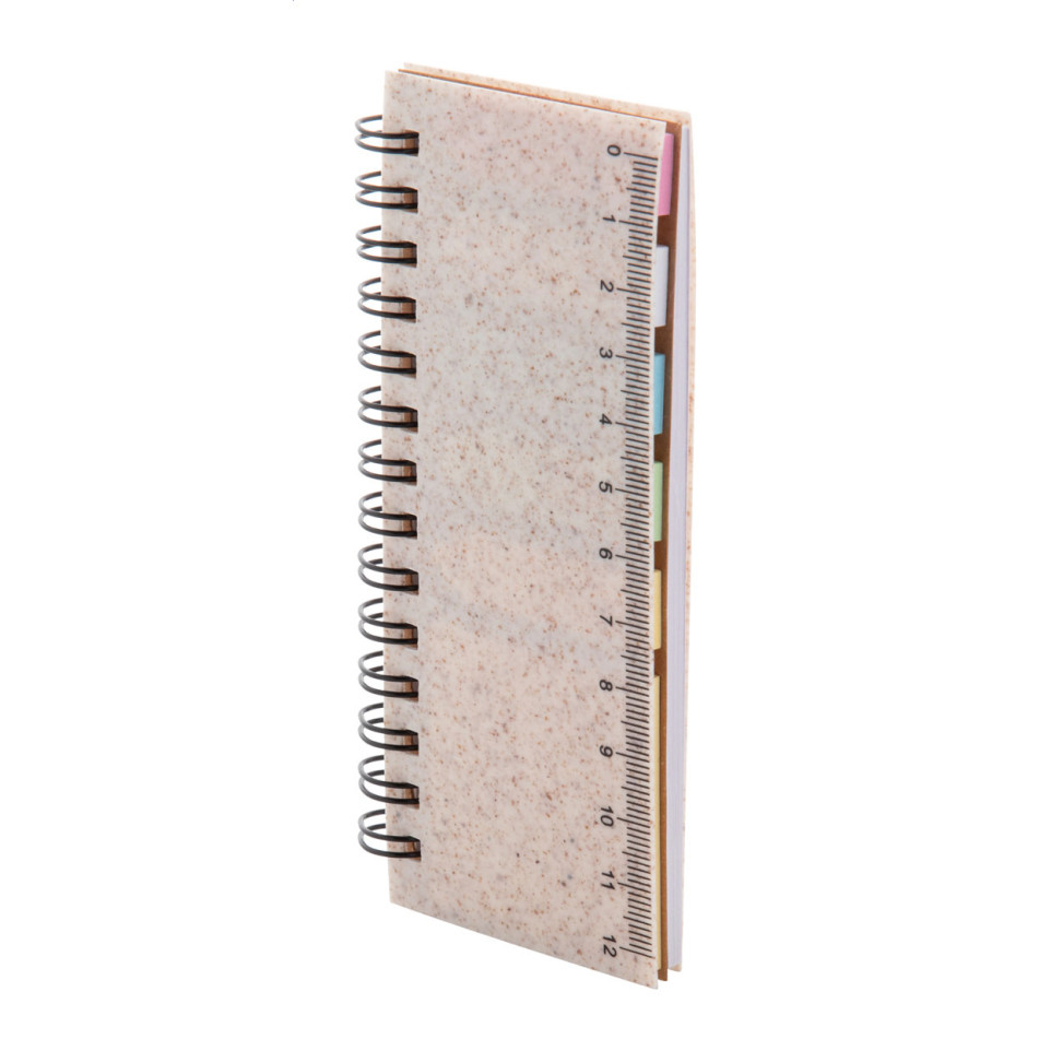 Carnet de notes écologique WheaNote Mini avec spirales, fabriqué à partir de plastique à base de paille de blé. Compact et pratique, ce cahier contient 40 feuilles lignées en papier recyclé, des notes autocollantes et des marqueurs de page colorés.