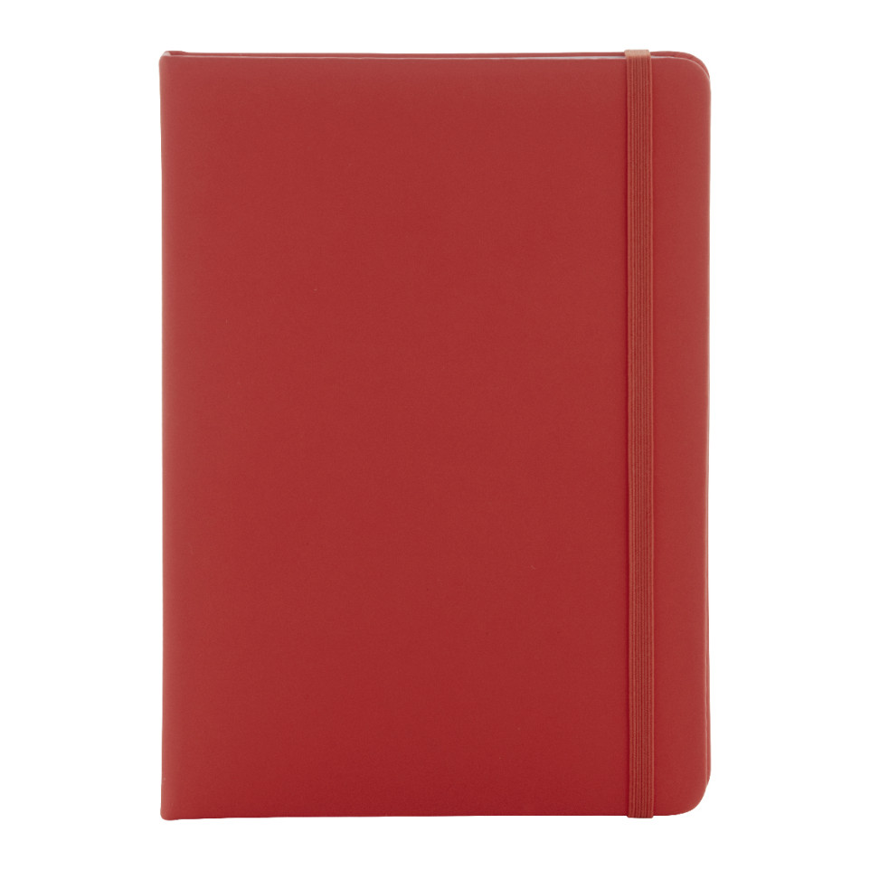 Carnet de notes A5 élégant recouvert de PU recyclé, doté de 100 feuilles lignées en papier recyclé, complété par un signet et un élastique de couleur rouge assortie, idéal pour les notes professionnelles et personnelles.