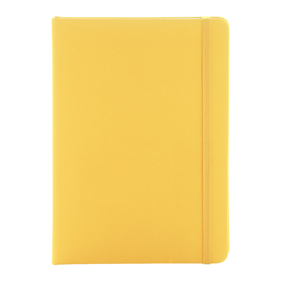 Carnet de notes format A5 avec couverture en similicuir recyclé jaune, muni de 100 feuilles vierges en papier recyclé. Idéal pour la prise de notes quotidienne, en réunion ou en déplacement professionnel.