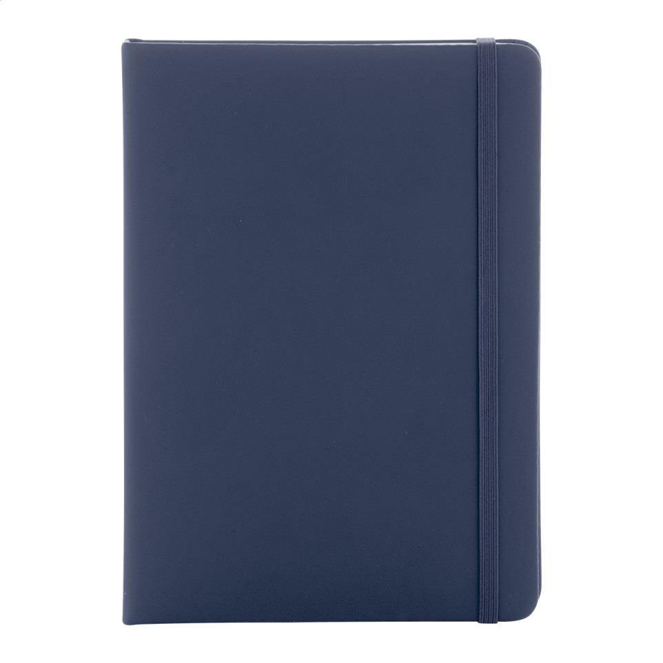 Carnet de notes A5 au design moderne, recouvert de similicuir recyclé bleu foncé, contenant 100 feuilles vierges en papier recyclé. Idéal pour la prise de notes quotidienne au bureau, en réunion ou lors de déplacements.