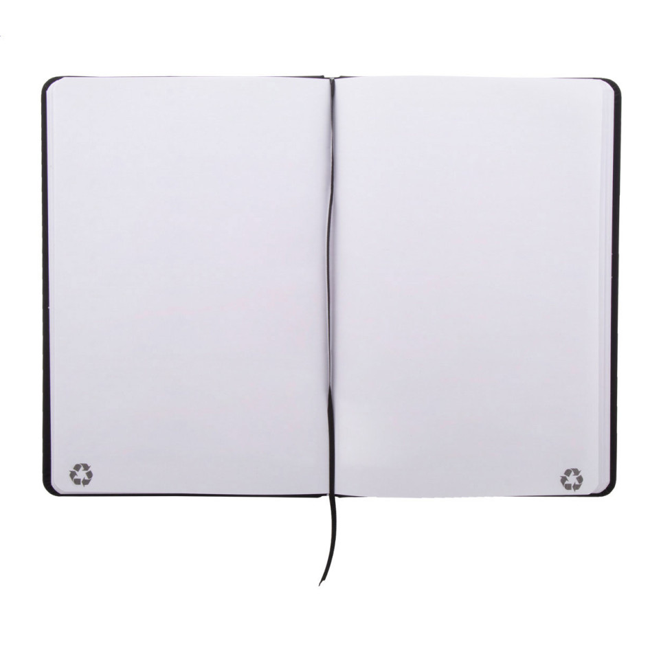 Carnet de notes Repuk Blank A5 noir, élégamment recouvert de similicuir recyclé, offrant 100 pages vierges pour vos idées. Équipé d'un marque-page et d'un élastique assorti, ce carnet associe fonctionnalité et engagement écologique.