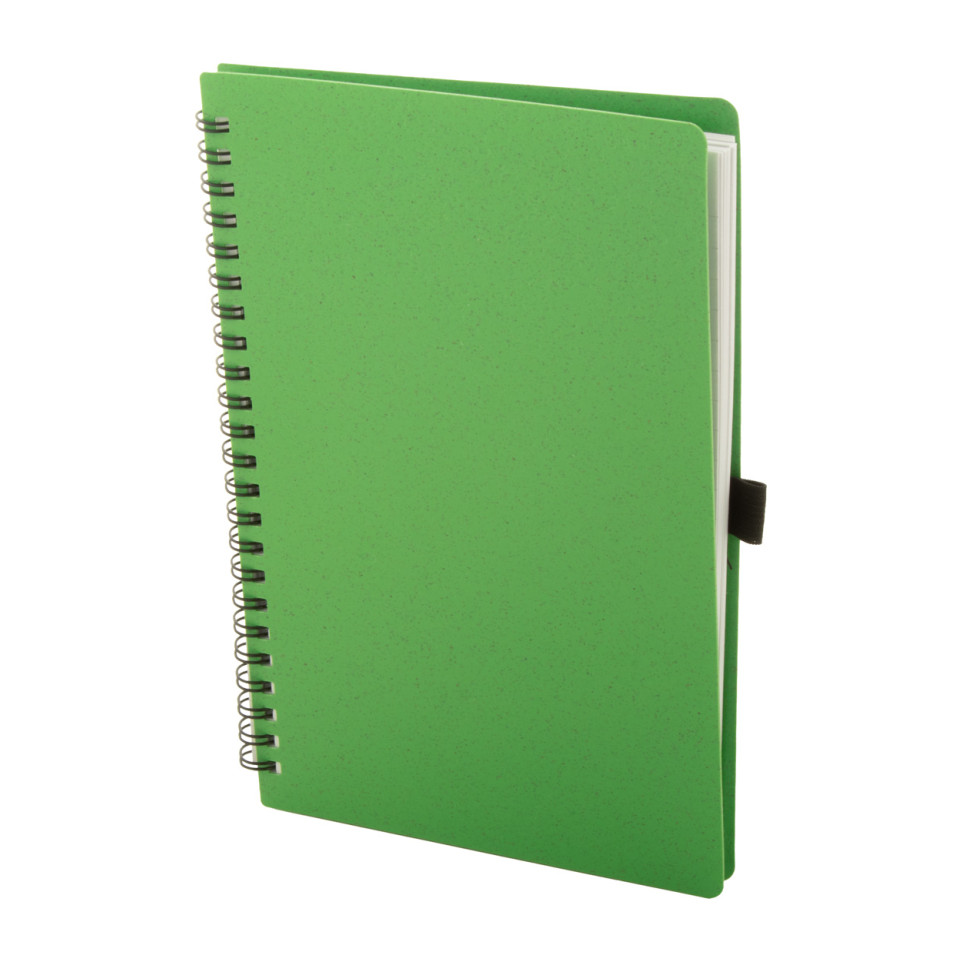 Le WheaNote A5 vert est un carnet de notes écologique à spirales, format A5, recouvert de plastique en paille de blé. Doté de 70 feuilles lignées en papier recyclé et d'un porte-stylo intégré, il allie fonctionnalité et respect de l'environnement.