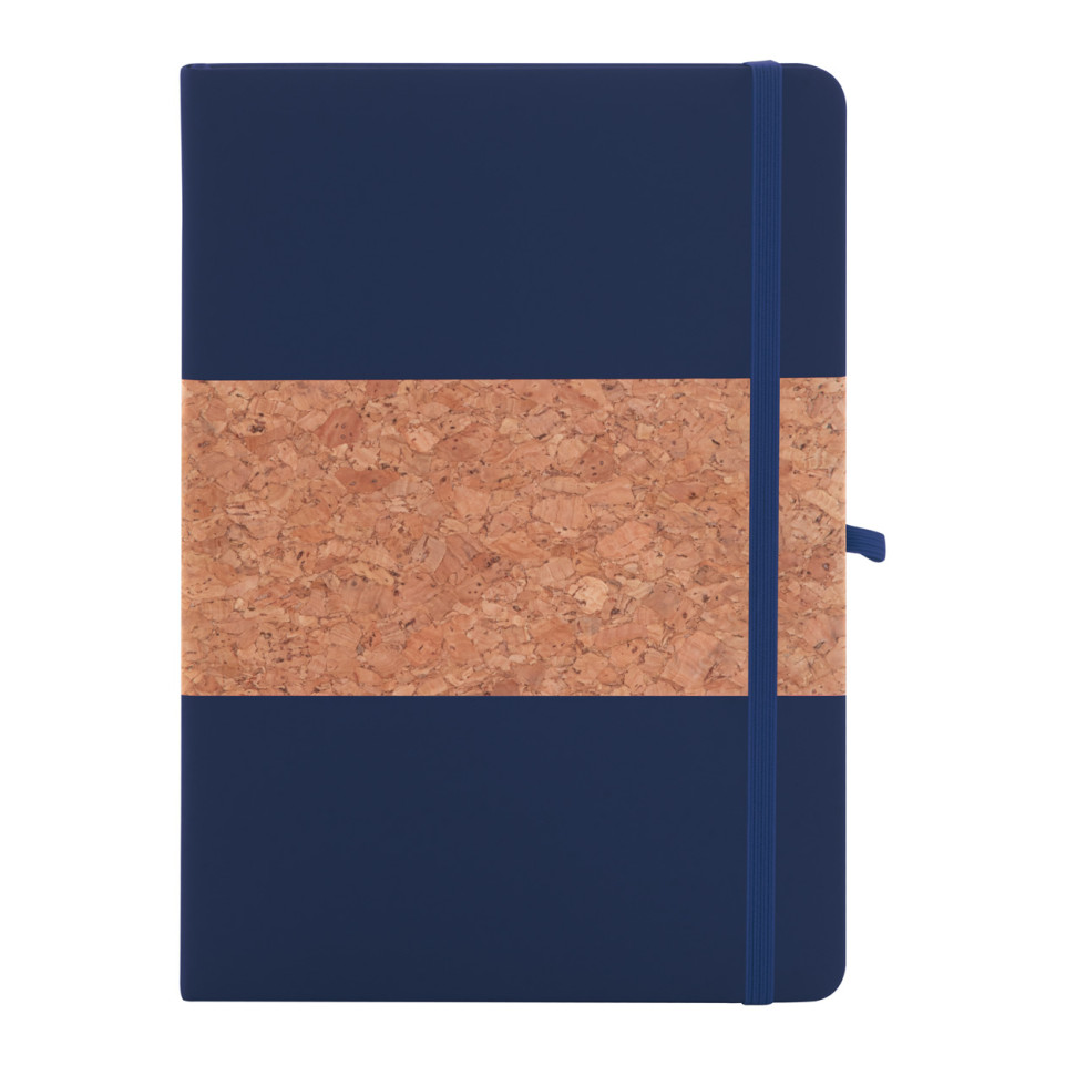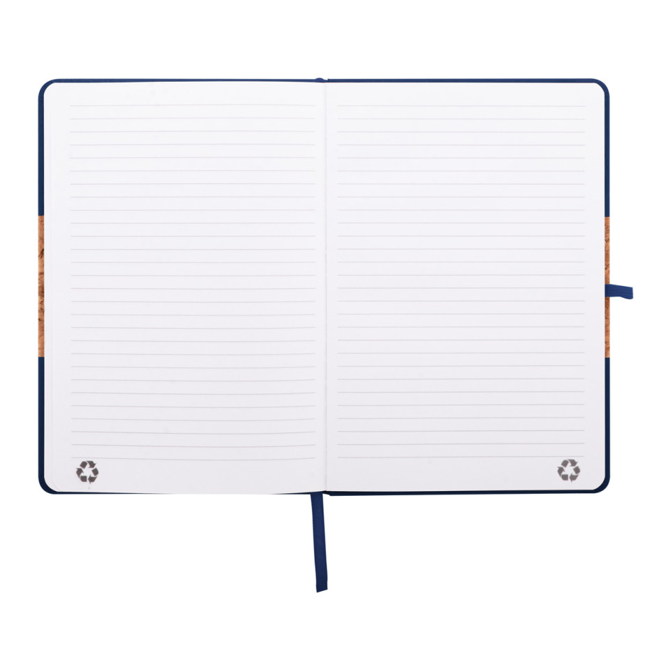 Carnet de notes élégant en RPU bleu foncé avec couverture en liège naturel et PU recyclé, idéal pour les professionnels soucieux de l'environnement qui recherchent un accessoire d'écriture fonctionnel et écologique pour leurs réunions et prises de notes quotidiennes.