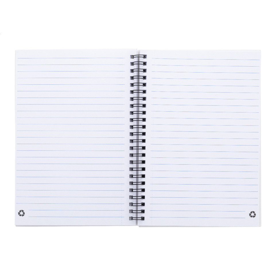 Carnet de notes au format A5 avec spirales, couverture en papier recyclé, comprenant 80 pages lignées également en papier recyclé, idéal pour la prise de notes au bureau, en réunion ou lors de formations.