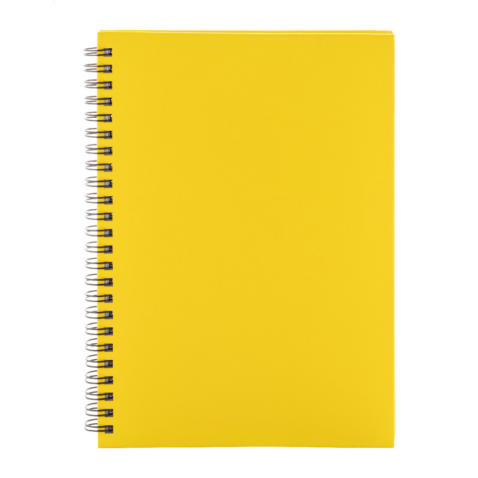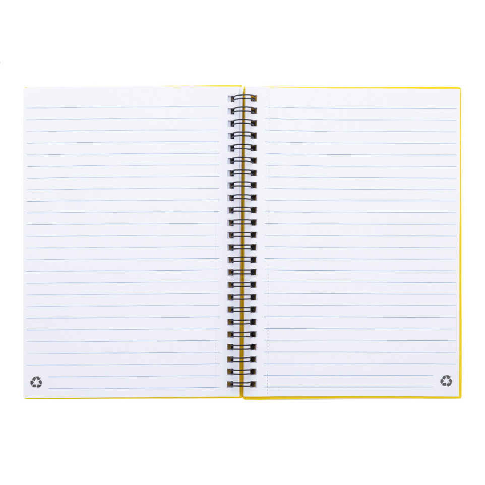 Carnet de notes jaune format A5 à spirales, doté de 80 pages lignées en papier recyclé. Idéal pour la prise de notes au bureau, lors de réunions ou en déplacement.