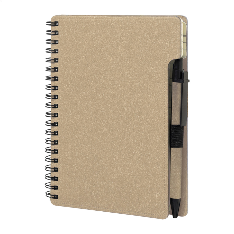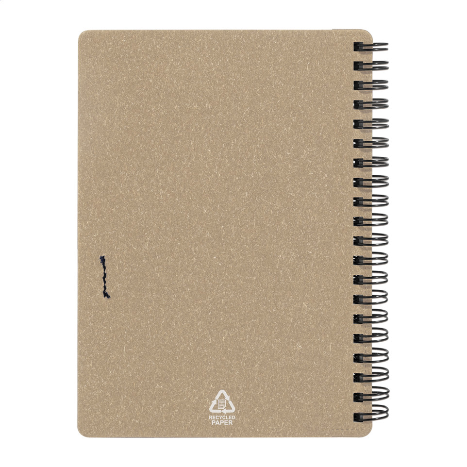Carnet à spirale format A6 en papier recyclé, accompagné d'un stylo à bille en polypropylène recyclé. Idéal pour la prise de notes au quotidien, en bureau ou en déplacement.