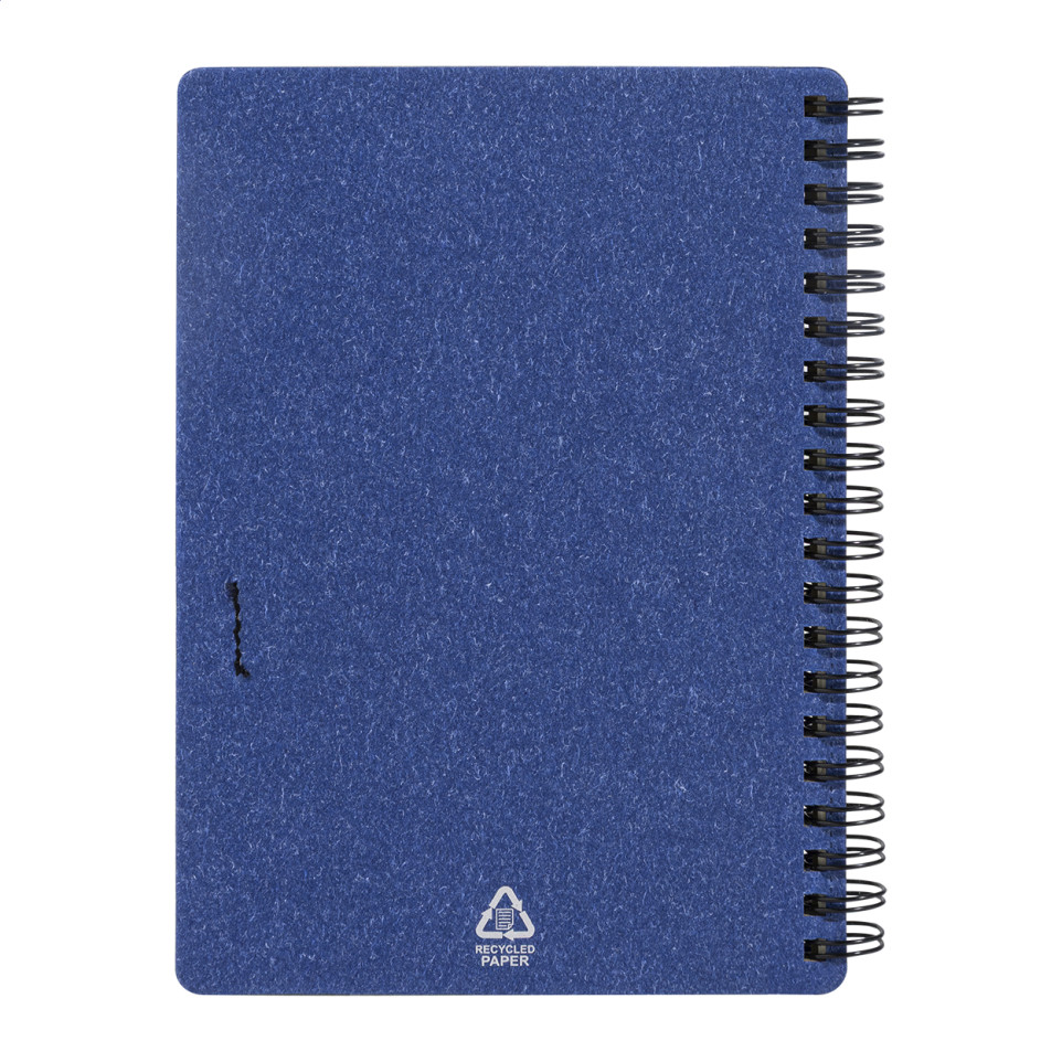 Carnet à spirale format A6 en papier recyclé, accompagné d'un stylo à bille en polypropylène recyclé. Idéal pour la prise de notes quotidienne, en bureau ou en déplacement.