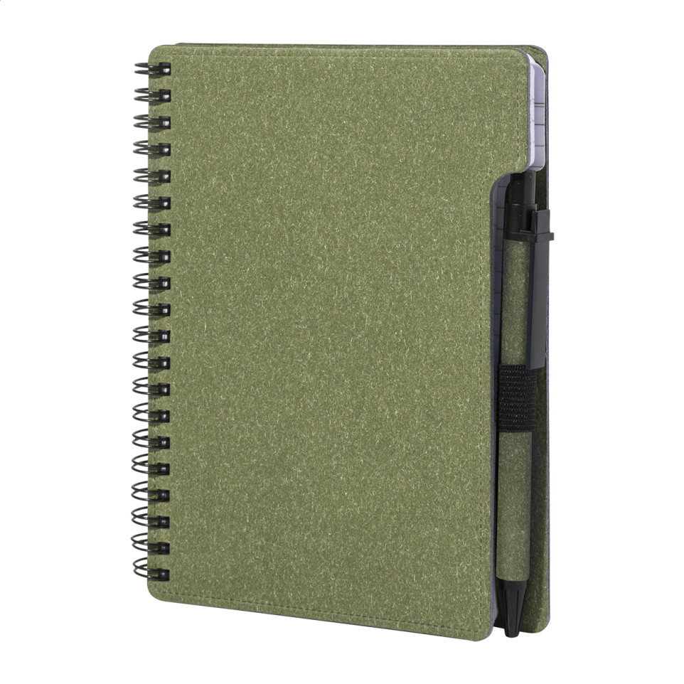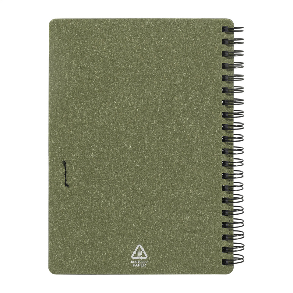 Carnet à spirale Balsamea vert en papier recyclé, format A6 avec 80 feuilles lignées. Accompagné d’un stylo à bille en polypropylène recyclé et encre bleue incluse, idéal pour notes quotidiennes ou organisation professionnelle.