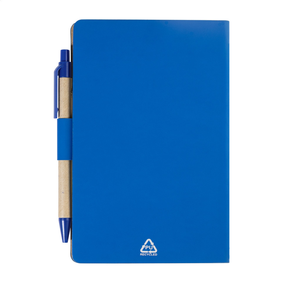 Carnet de notes au format pratique, recouvert de PU recyclé, idéal pour la prise de notes au quotidien, au bureau ou en déplacement. Livré avec un stylo bille intégré.