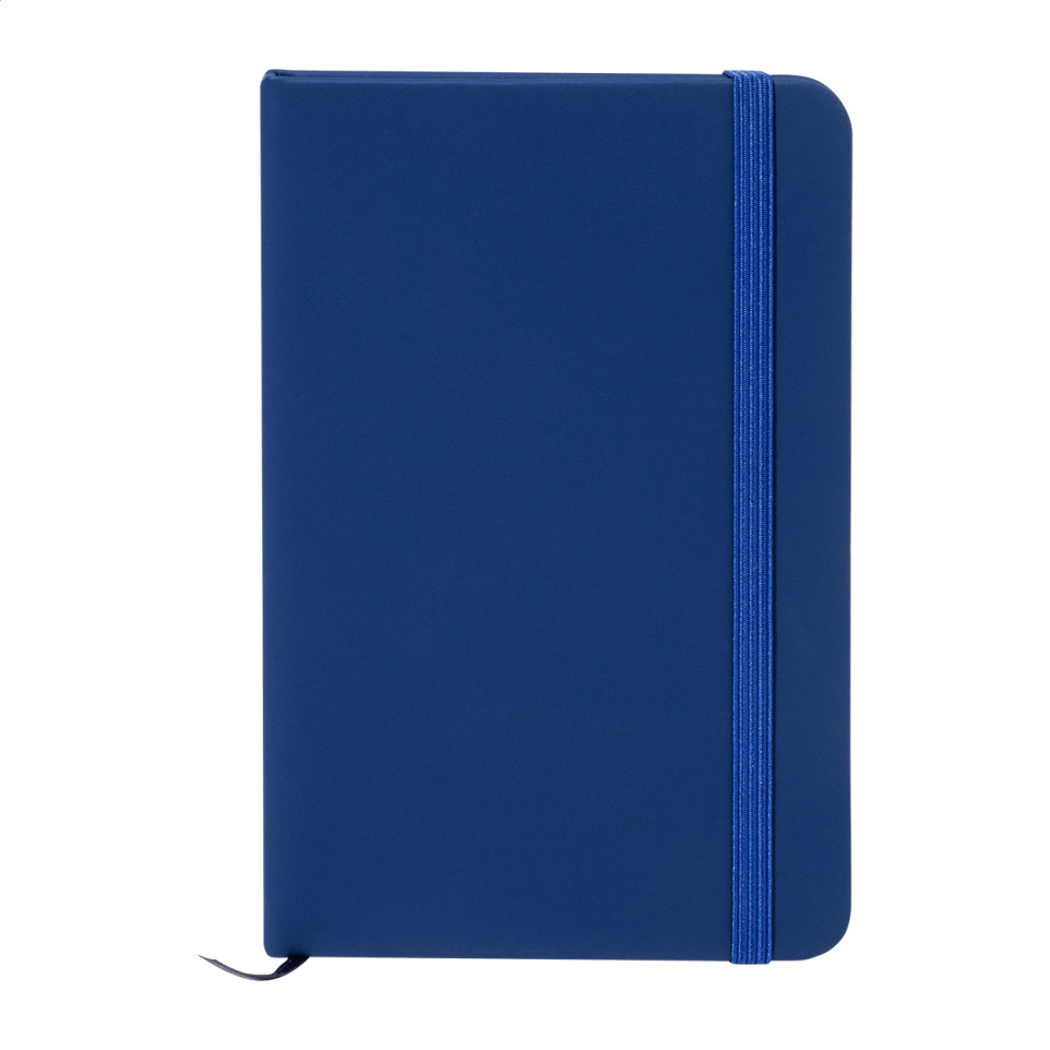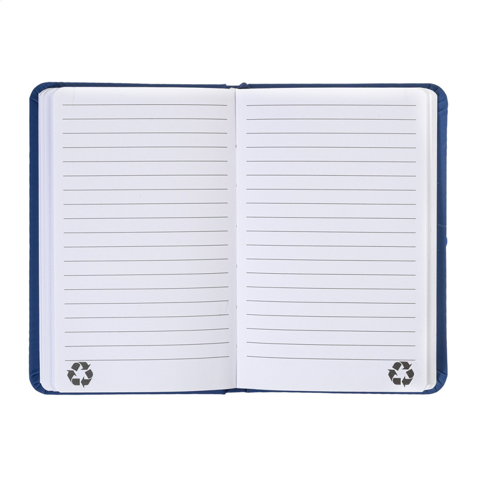 Carnet de notes format A6 aux dimensions pratiques (95 × 145 × 15 mm), conçu pour le quotidien professionnel et personnel. Recouvert de PU recyclé bleu avec 100 feuilles lignées en papier recyclé, il intègre un signet et un élastique assortis.