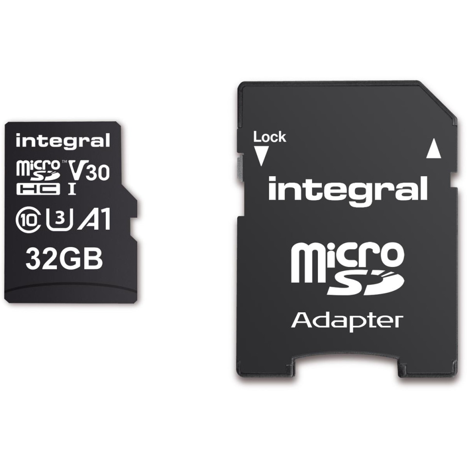 Carte mémoire microSDXC Integral de 32 Go, classée V30 et Class 10, adaptée aux appareils exigeants comme les caméras de sécurité et les drones pour un enregistrement vidéo fluide.