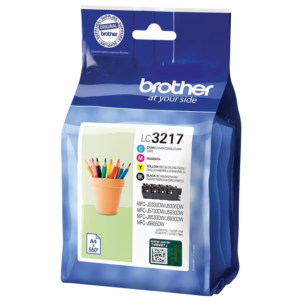 Multipack de cartouches d’encre Brother LC-3217VAL comprenant les couleurs cyan, magenta, jaune et noir, conçu pour les imprimantes Brother MFC-J5330DW, MFC-J5730DW, MFC-J5930DW, MFC-J6530DW, MFC-J6930DW et MFC-J6935DW. Adapté à un usage professionnel ou domestique exigeant une impression fiable et nette.