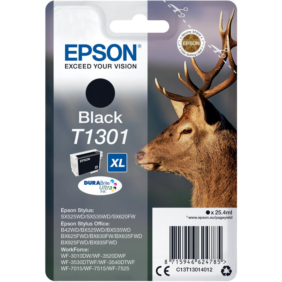 La cartouche d’encre Epson T1301 noire est conçue pour l’impression bureautique exigeante et s’adresse aux utilisateurs des imprimantes Stylus Office, WorkForce et Stylus SX. Elle offre une capacité XL de 25,4 ml, permettant d’imprimer jusqu’à 945 pages en noir avec une qualité constante.