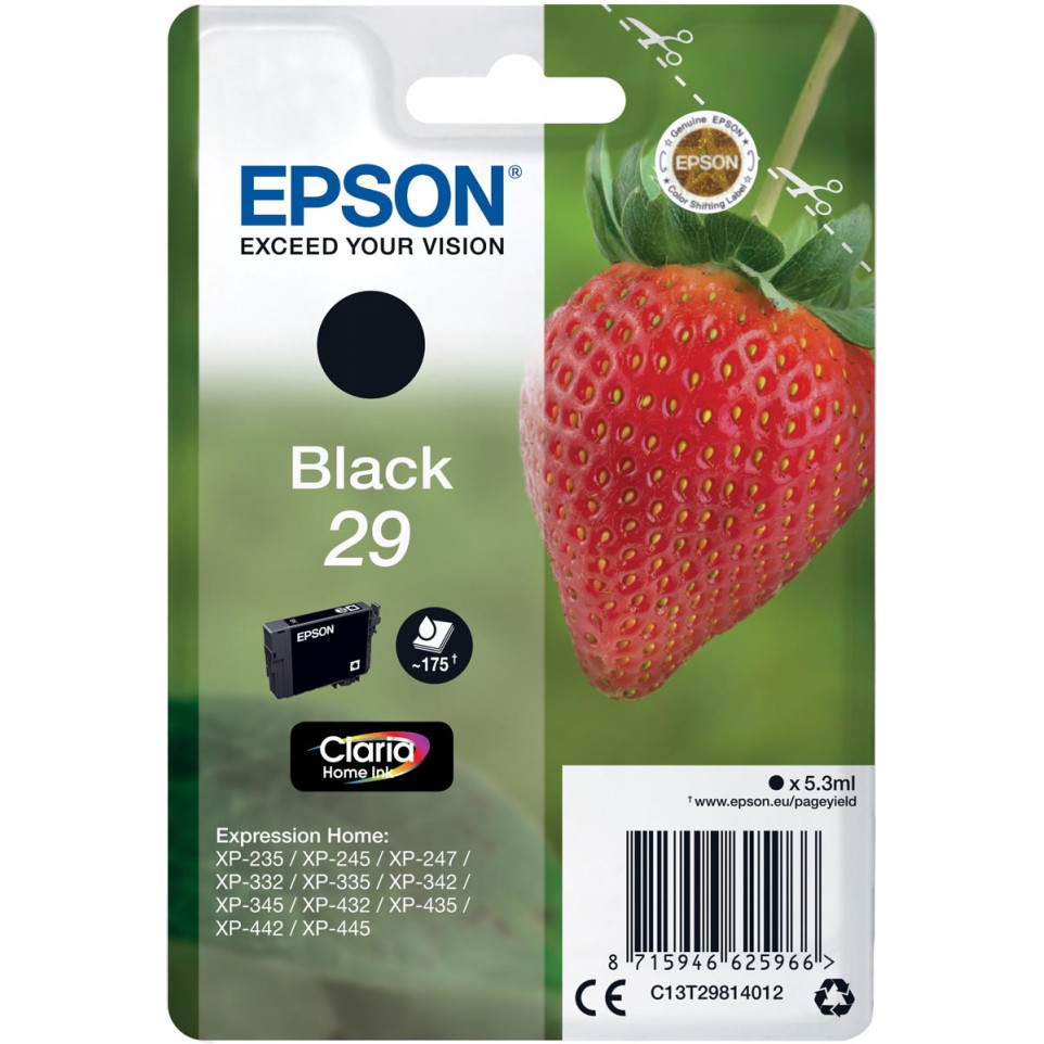 Cartouche d’encre noire Epson 29, référence C13T29814012, conçue pour les imprimantes jet d’encre Epson XP 235 et XP 335. Permet d’imprimer jusqu’à 175 pages avec une grande netteté pour les usages quotidiens.