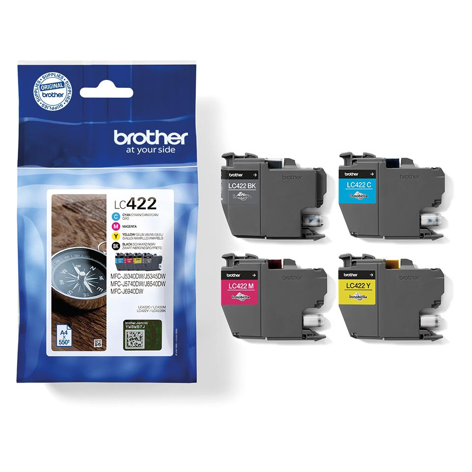 Cartouche d’encre Brother OEM LC-422VAL standard, multipack de 4 couleurs (noir, cyan, magenta, jaune), conçue pour les imprimantes jet d’encre Brother MFC-J5740DW, MFC-J6540DW, MFC-J6940DW et MFC-J5340DW. Idéale pour obtenir des impressions nettes et fiables au bureau comme à la maison.