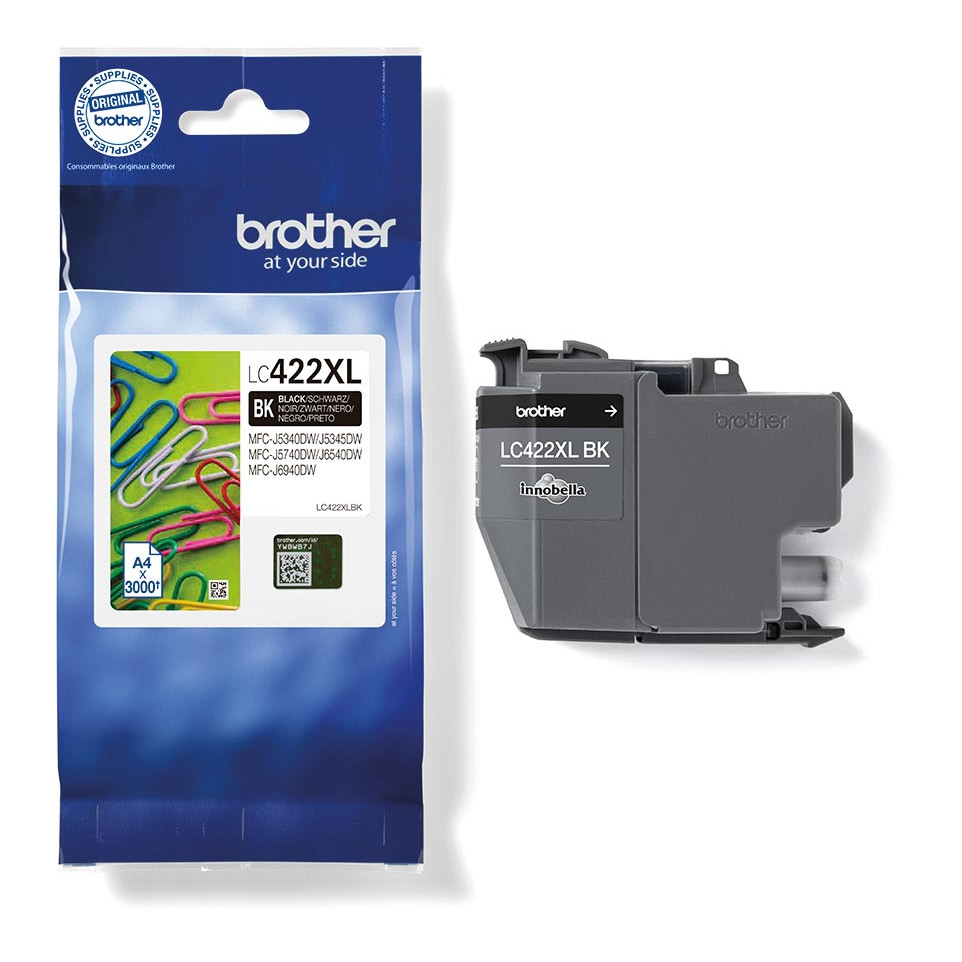 Cartouche d’encre noire Brother LC-422XLBK haute capacité, idéale pour les imprimantes MFC-J5740DW, MFC-J6540DW, MFC-J6940DW et MFC-J5340DW. Elle permet d’imprimer jusqu’à 3 000 pages, assurant des impressions nettes et fiables pour un usage professionnel ou domestique intensif.