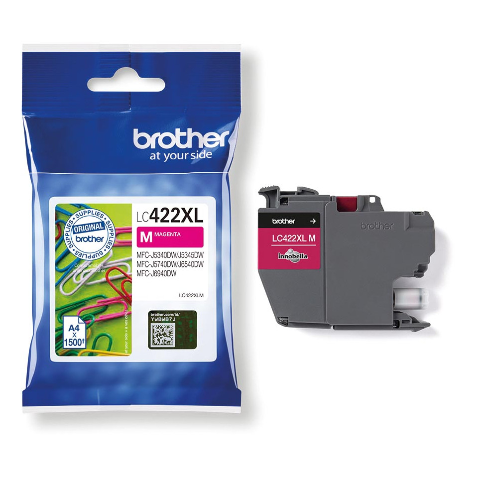 Cartouche d’encre magenta Brother LC-422XLM, spécialement conçue pour les imprimantes MFC-J5340DW, MFC-J5740DW, MFC-J6540DW et MFC-J6940DW. Idéale pour les besoins d’impression fréquents au bureau ou à domicile, elle offre un rendement élevé.