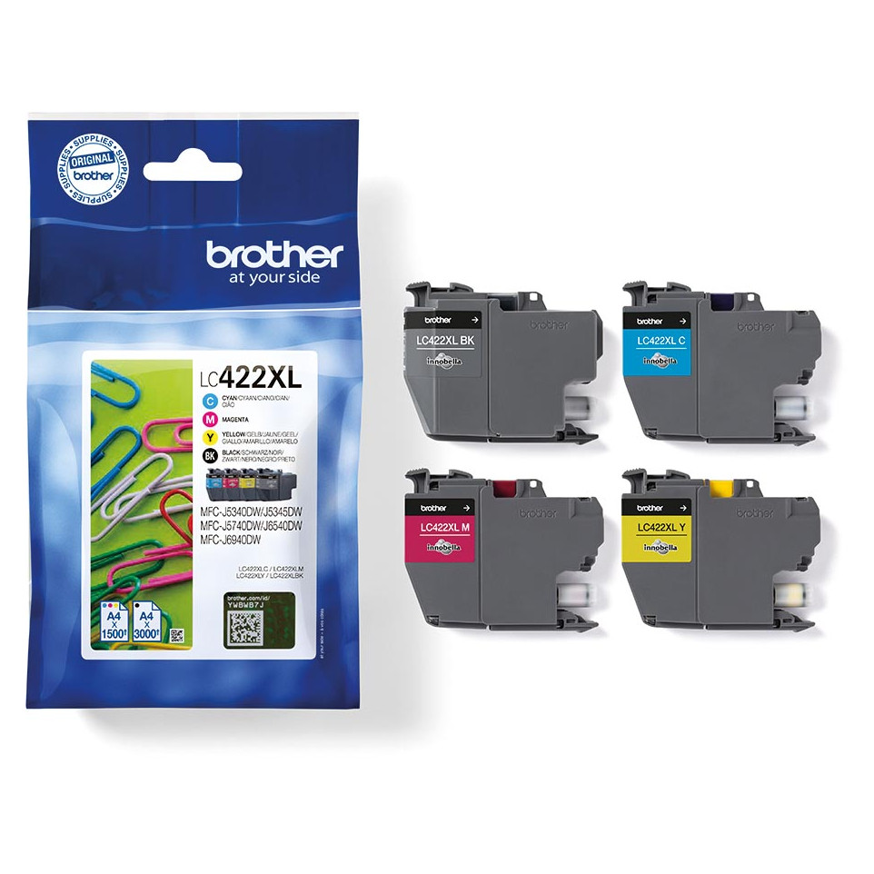 Cartouche d’encre originale Brother LC-422XLVAL, multipack de 4 couleurs (noir, cyan, magenta, jaune), spécialement conçue pour les imprimantes à jet d’encre Brother MFC-J5740DW, MFC-J6540DW, MFC-J6940DW et MFC-J5340DW. Idéale pour des impressions fiables et de qualité professionnelle à grand volume.