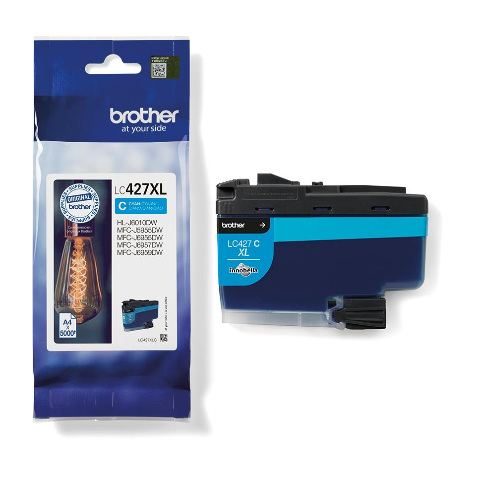 La cartouche d'encre Brother LC-427XLC, cyan haute capacité, est spécialement conçue pour les imprimantes jet d’encre Brother, notamment le modèle HL-J6010DW. Idéale pour les volumes d’impression importants, elle permet de réaliser jusqu’à 5 000 pages en couleur.