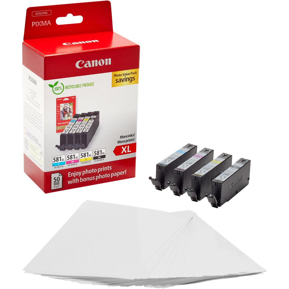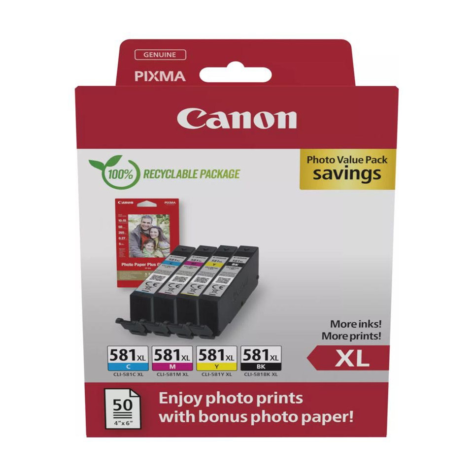 Pack photo Canon CLI-581 XL comprenant 4 cartouches d’encre couleur et un lot de 50 feuilles de papier photo 10 x 15 cm, conçu pour l’impression couleur de photos ou documents sur une large gamme d’imprimantes Canon PIXMA compatibles.