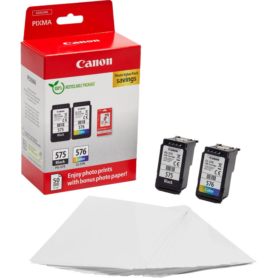 Pack Canon photo value PG-575 / CL-576 comprenant une cartouche noire et une cartouche couleur, accompagné de 50 feuilles de papier photo 10 x 15 cm. Adapté aux imprimantes PIXMA TS3550i, TS3551i, TR4750i, TR4751i. Permet d’imprimer jusqu’à 100 pages.