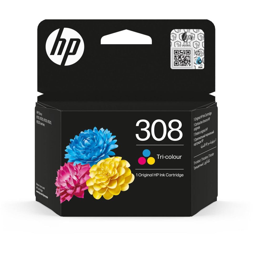 La cartouche d'encre HP 308, référence 7FP20UE, est conçue pour les imprimantes HP Envy 6110e, 6120e, 6122e, 6130e, 6132e, 6520e, 6530e, 6532e, 6558e et 6165e. Elle offre une impression tricolore (cyan, magenta, jaune) et une capacité standard de 120 pages.