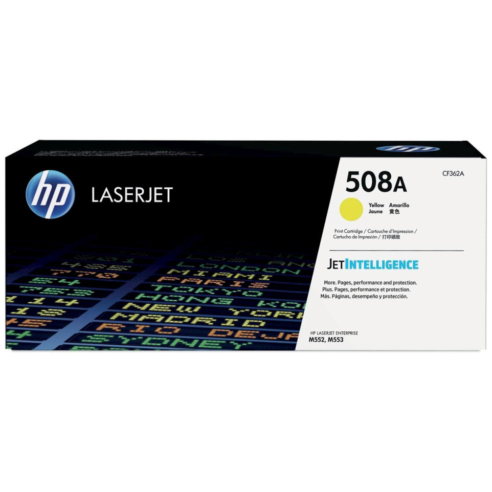 Toner jaune HP 508A (CF362A), conçu spécifiquement pour les imprimantes HP Color LaserJet Enterprise M550 Series. Idéal pour les environnements professionnels nécessitant des impressions couleur fiables et précises jusqu'à 5 000 pages.