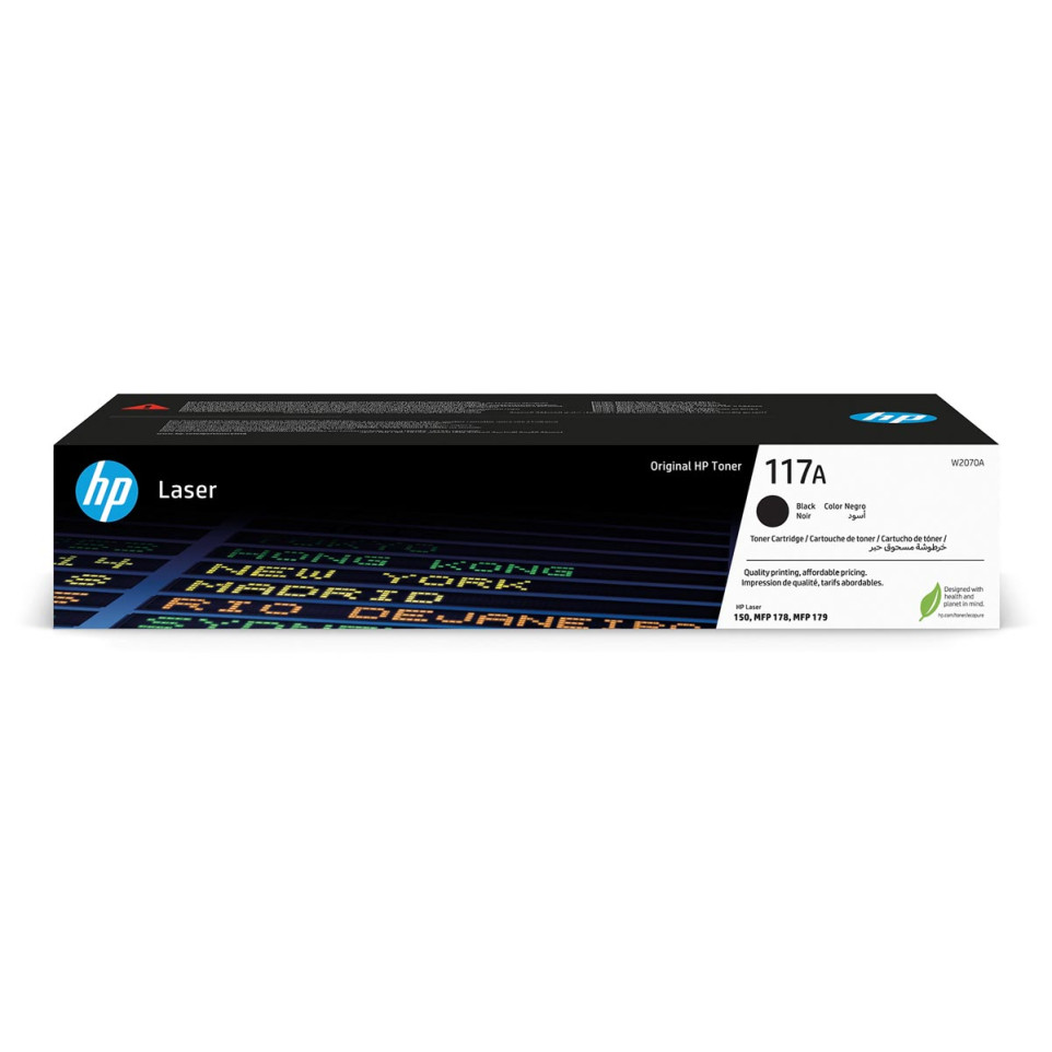 Cartouche de toner HP 117A noire, référence W2070A, conçue pour les imprimantes HP LaserJet 150, 178 et 179. Elle offre une capacité d’impression d’environ 1 000 pages, idéale pour un usage bureautique quotidien et des impressions nettes en noir et blanc.