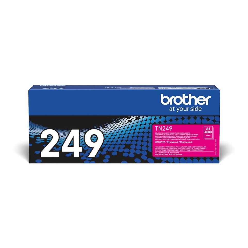La cartouche de toner Brother TN-249M magenta permet d’imprimer jusqu’à 4 000 pages avec une qualité professionnelle, conçue pour répondre aux besoins des utilisateurs exigeants sur les modèles HL-L8240CDW, HL-L8230CDW, MFC-L8340CDW et MFC-L8390CDW.