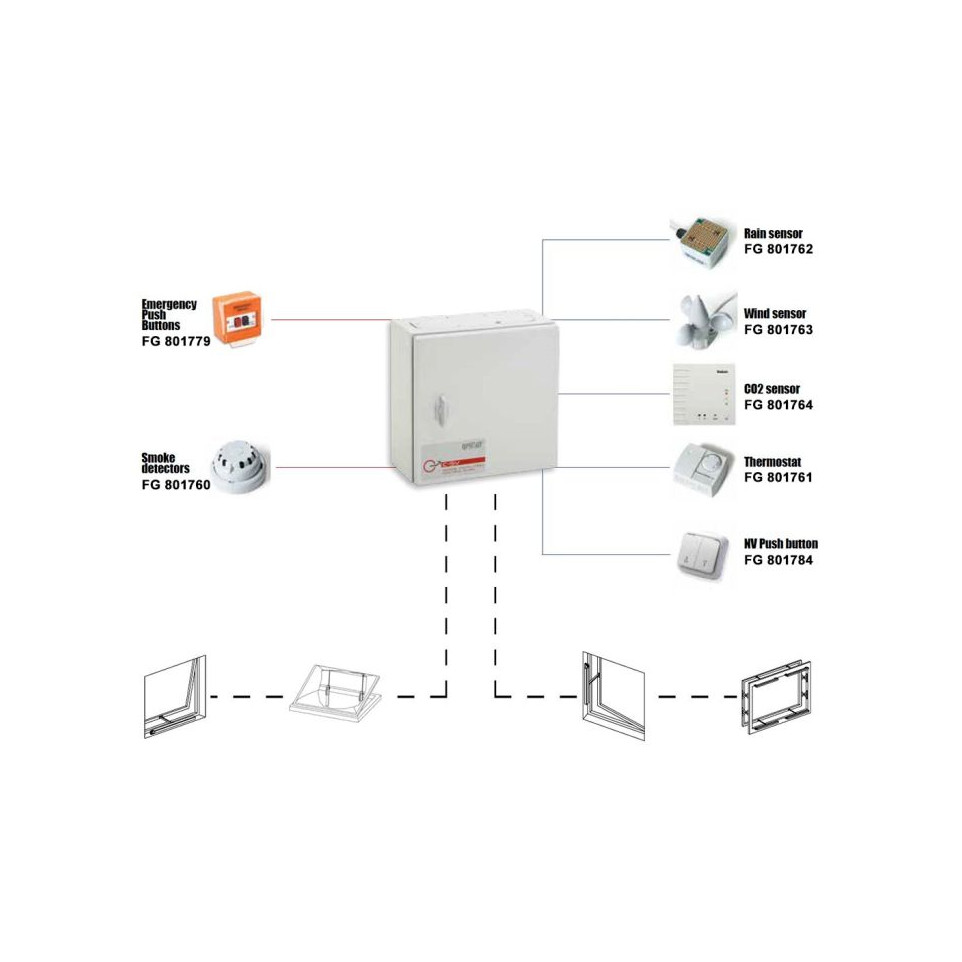 La centrale reçoit les signaux d’alarme (fumée, déclencheur manuel) et active l’ouverture des fenêtres motorisées pour permettre l’évacuation des fumées ou la ventilation. Elle autorise aussi l’ouverture manuelle selon différents capteurs environnementaux, avec gestion indépendante pour deux groupes de fenêtres et alertes intégrées pour tout type d’anomalie.