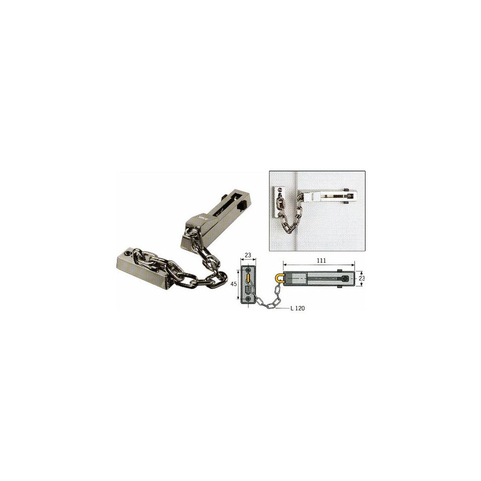 Installer la chaîne sur le montant de la porte et le support sur le vantail. Lorsqu’un visiteur sonne, la porte s’ouvre partiellement, la chaîne limitant le passage. Le cran à ressort empêche les enfants d’ouvrir totalement la porte sans intervention d’un adulte.