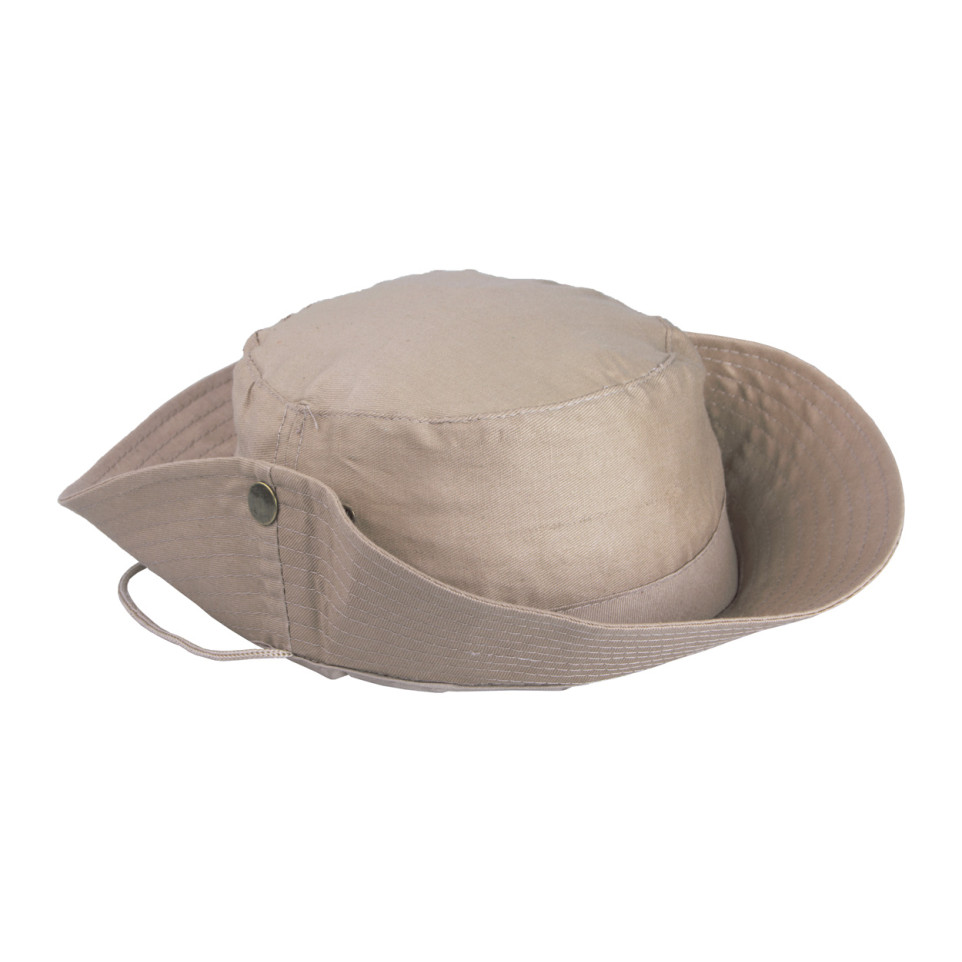 Chapeau kaki 100% coton équipé d’une cordelette réglable avec attache en métal, pensé pour une utilisation quotidienne en extérieur, offrant confort et protection lors d’activités de plein air.