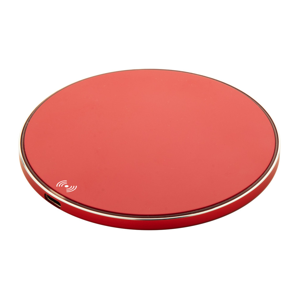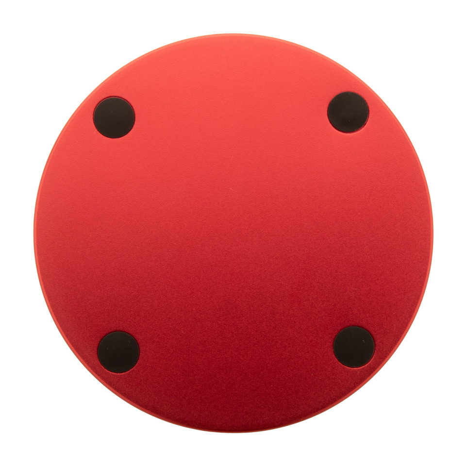 Chargeur rapide sans fil Walger rouge, conçu en aluminium recyclé, délivrant une puissance de 15W pour une charge efficace de vos appareils compatibles. Son design compact s’adapte parfaitement au bureau ou à l’espace personnel.
