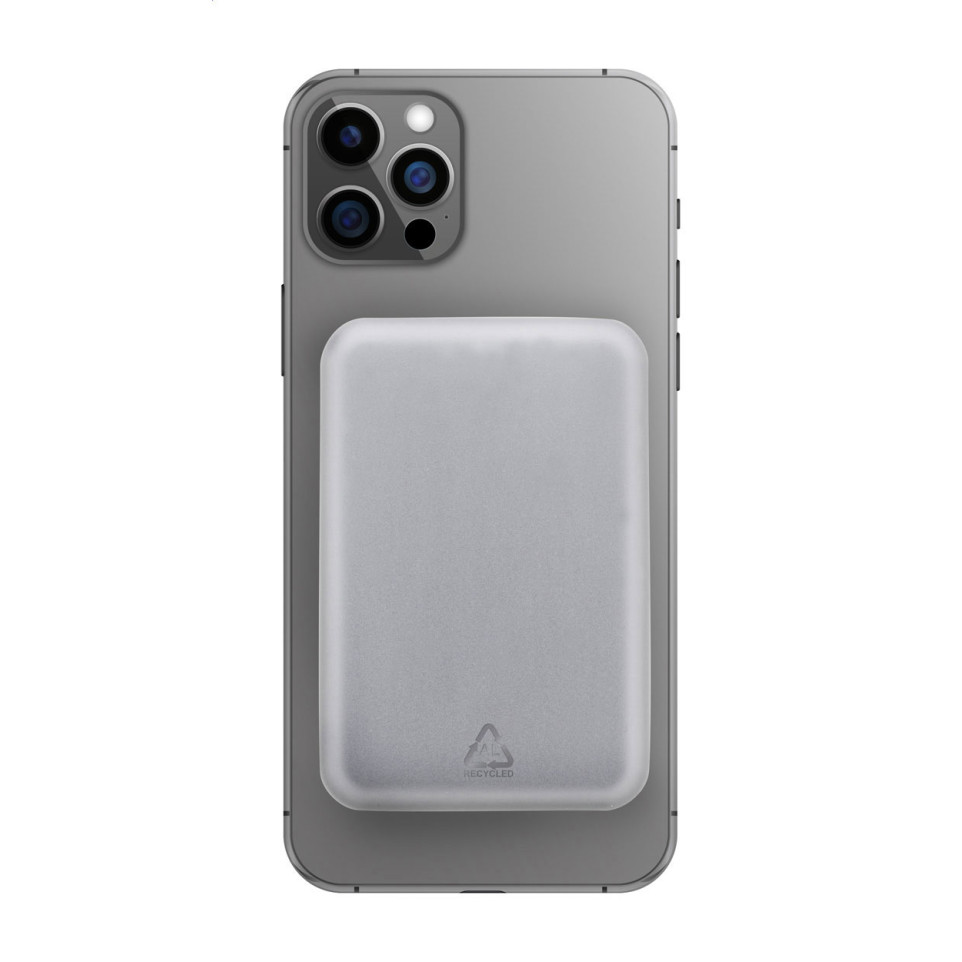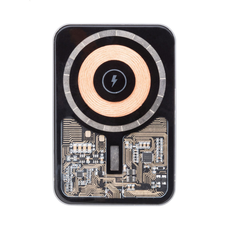 Batterie externe compacte en aluminium recyclé, dotée d’un boîtier semi-transparent laissant apparaître les composants électroniques. Permet la recharge rapide sans fil magnétique et filaire de vos appareils en déplacement, compatible notamment avec iPhone 12 et modèles ultérieurs.