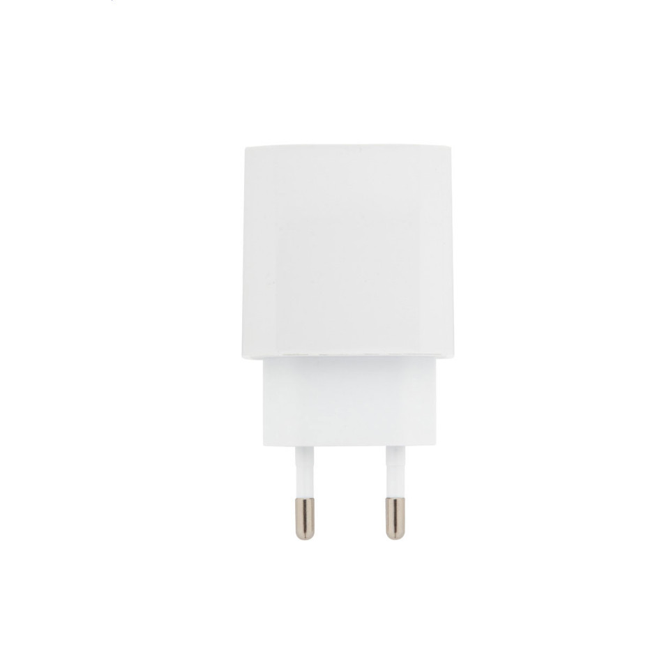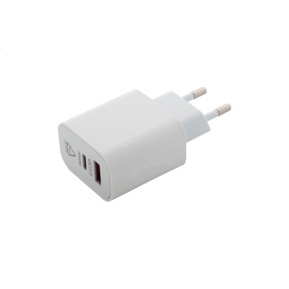 Chargeur mural USB RABS en ABS recyclé offrant une charge rapide avec double connectique USB et USB-C. Solution écoresponsable et performante pour recharger vos appareils mobiles à la maison ou au bureau.