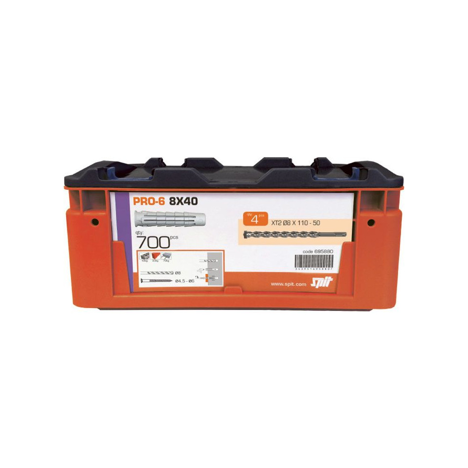 Coffret complet de 700 chevilles Spit Pro 6 accompagné de 4 forets, conçu pour la fixation fiable dans les matériaux creux et pleins, idéal pour l’aménagement intérieur, la rénovation ou les chantiers professionnels.