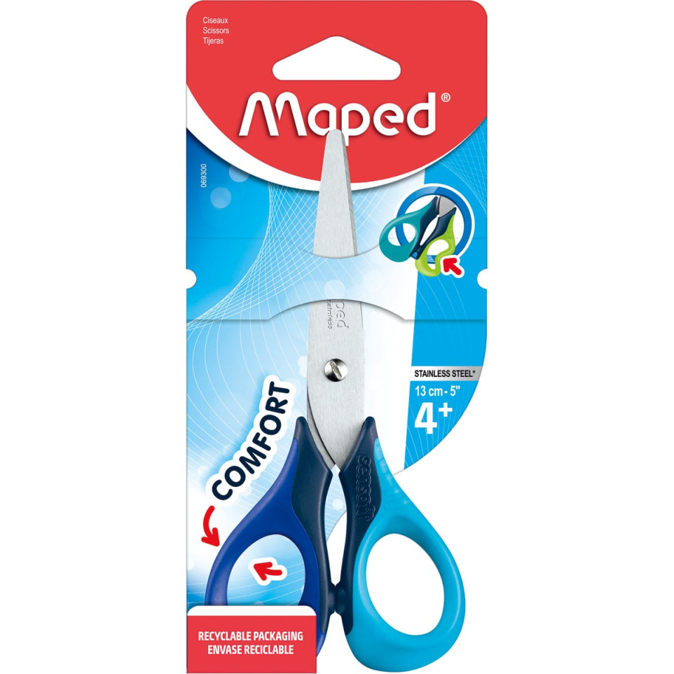 Ciseaux Maped Sensoft de 13 cm conçus pour droitiers, dotés de bouts ronds pour une sécurité accrue. Idéal pour les activités scolaires et créatives, il assure une coupe précise tout en restant confortable à utiliser, même sur de longues périodes.