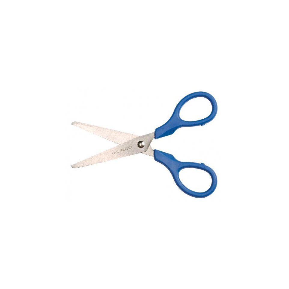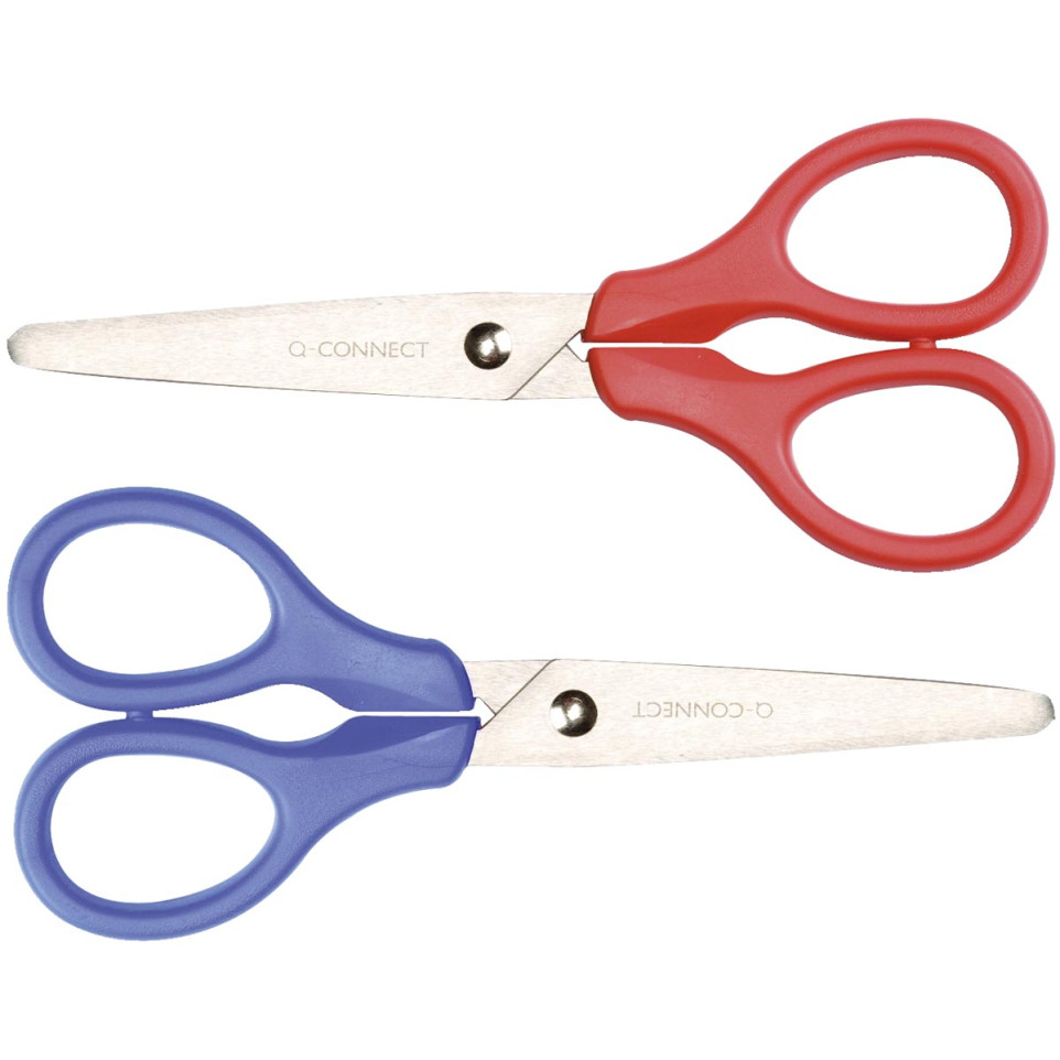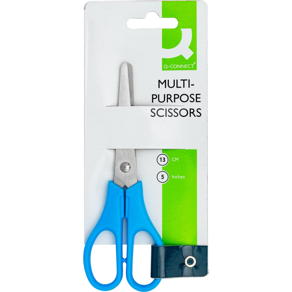 Ciseaux polyvalents Q-CONNECT de 13 cm, adaptés pour la bureautique et la maison. Leur conception ergonomique permet une prise en main confortable, idéale pour droitiers et gauchers, avec des anneaux symétriques et des bouts ronds pour plus de sécurité.