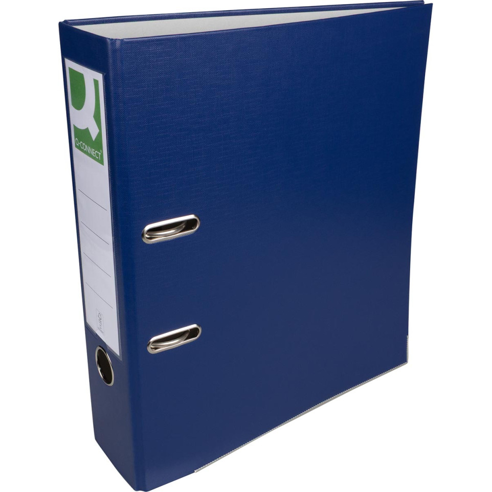 Classeur à levier Q-CONNECT au format A4, conçu pour le classement des documents professionnels ou scolaires. Fabriqué en carton recouvert de polypropylène bleu foncé, avec dos de 8 cm, il offre une grande capacité de rangement.