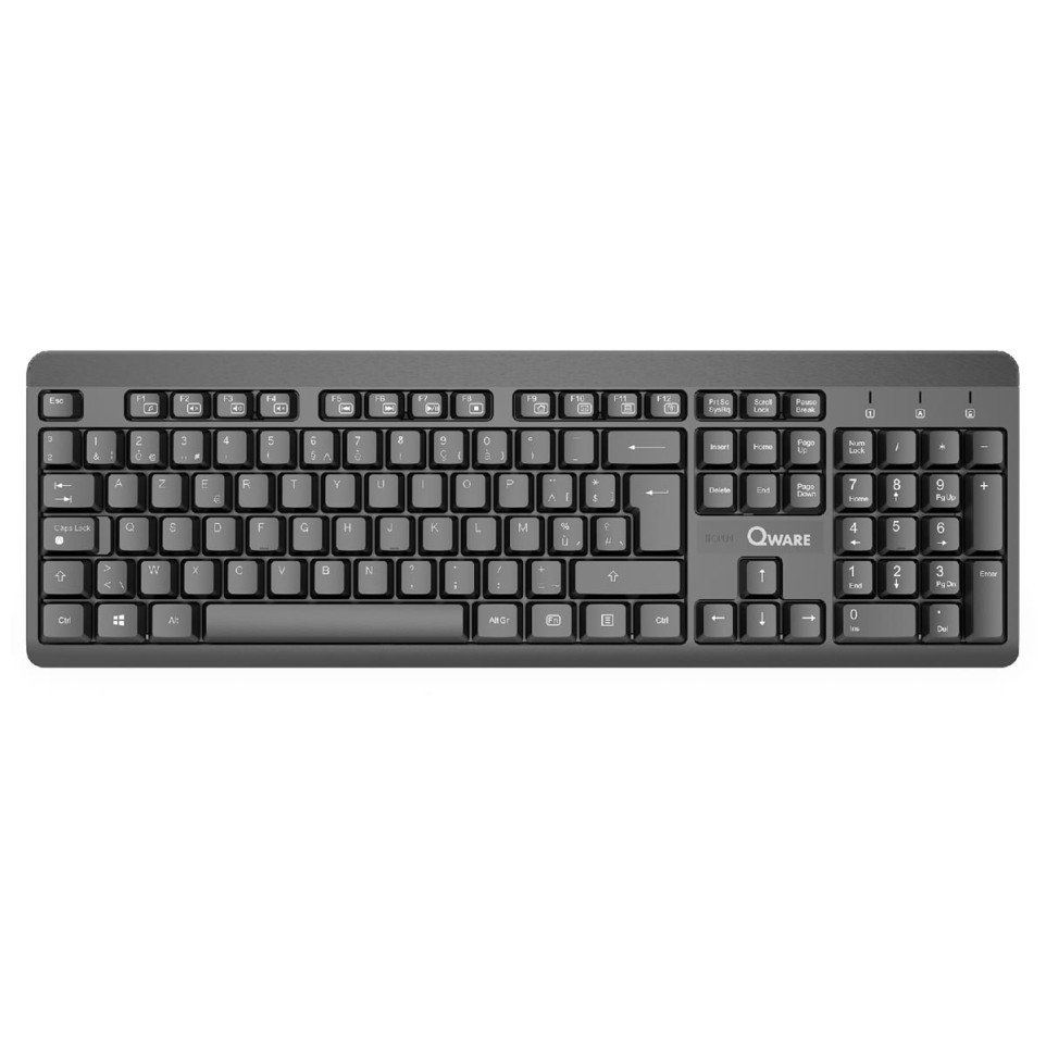 Clavier sans fil Qware Swindon au format classique, conçu pour une frappe confortable au quotidien, doté d’une disposition QWERTY et d’un coloris noir sobre, idéal pour le bureau ou la maison.