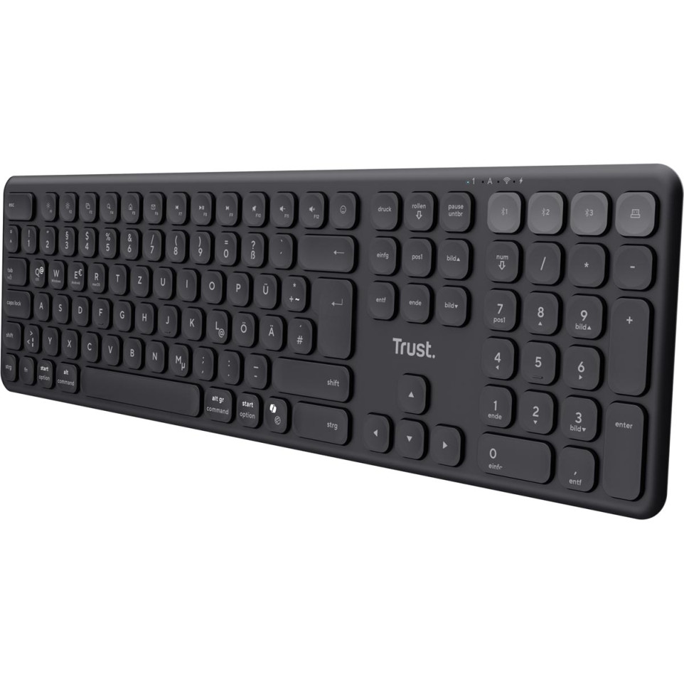 Clavier sans fil grand format Trust Vaiya, conçu pour connecter et basculer facilement entre jusqu’à quatre appareils grâce à la connectivité 2,4 GHz (avec microrécepteur USB) et Bluetooth. Idéal pour un usage professionnel ou domestique nécessitant une gestion multi-appareils avec une disposition QWERTY classique.