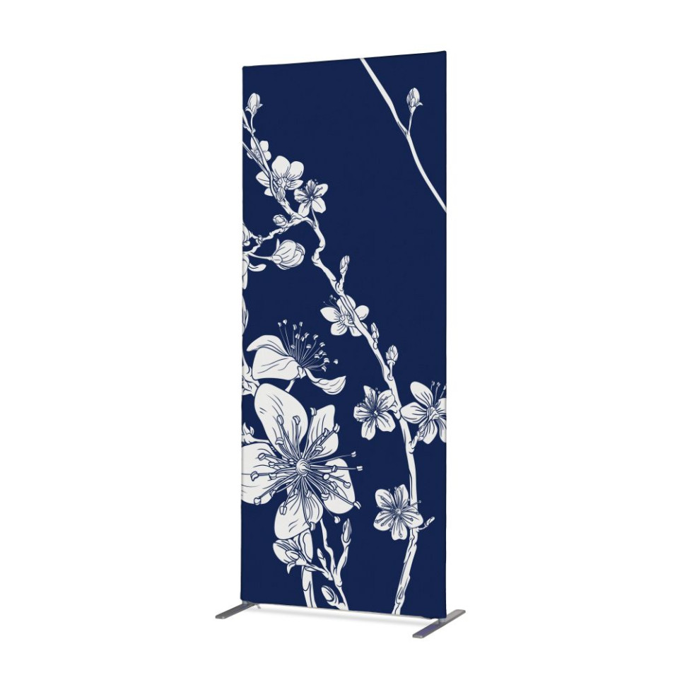 La Cloison Déco En Tissu Fleurs De Cerisier Japonais Abstraites Bleues ECO est un ensemble Zipper-Banner Slim avec impression double-face, idéal pour structurer et décorer des espaces professionnels avec élégance.