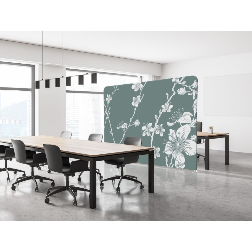 Cloison décorative en tissu double face imprimée d'un motif fleurs de cerisier japonais abstraites vertes, conçue pour structurer et habiller les espaces professionnels avec élégance.