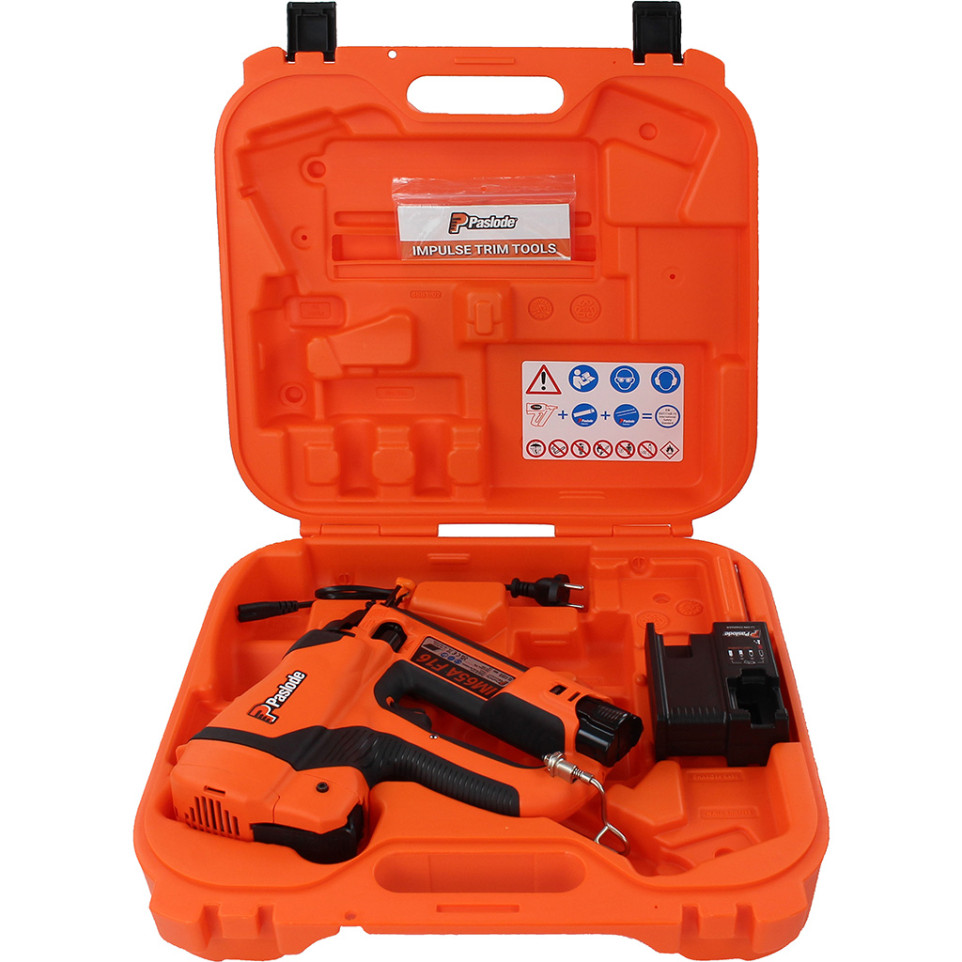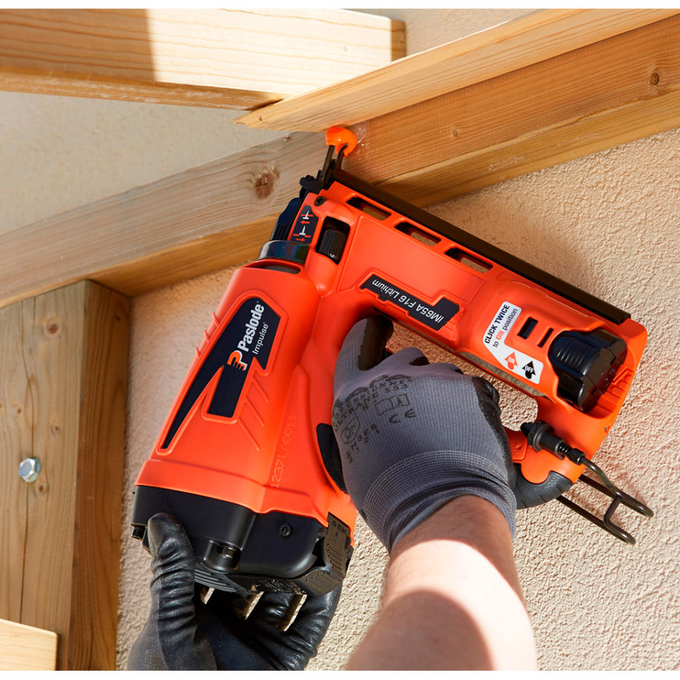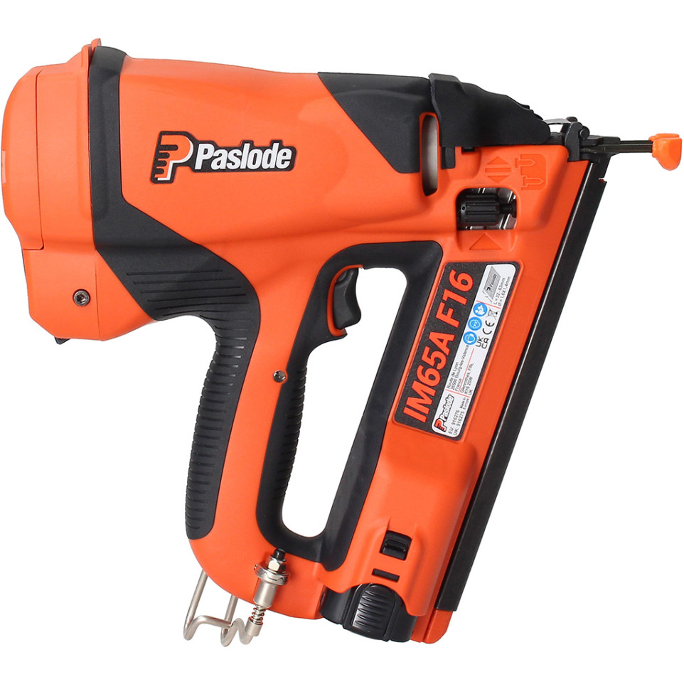 Cloueuse à gaz Paslode IMPULSE IM65A F16 conçue pour les menuisiers, parfait pour la fixation de moulures, plinthes et habillages dans des espaces exigus. Magasin incliné et nez équipé de caoutchouc assurant une finition précise.