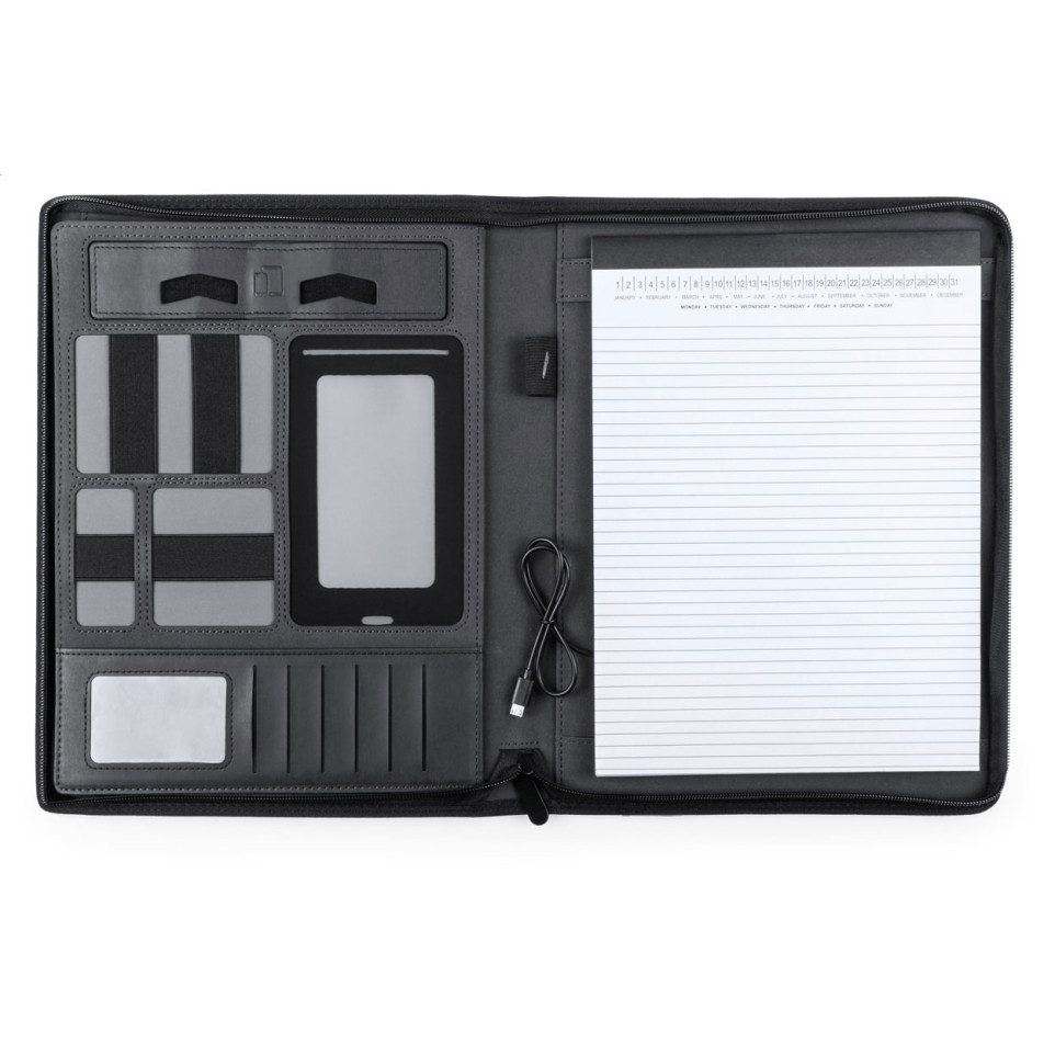 Le Rogers noir est un porte-documents élégant en similicuir PU intégrant une batterie externe de 5000 mAh, un bloc-notes de 20 feuilles et des supports pour téléphone portable et tablette, idéal pour les professionnels en déplacement.
