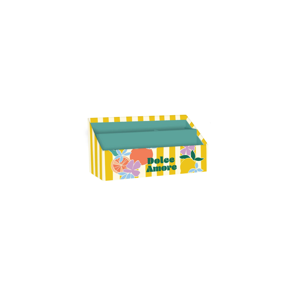 Dolce Amore, Porte lettres 25x10x14 cm Laissez-vous séduire par Dolce Amore, une collection pétillante qui évoque un été sans fin, où l'éclat des couleurs apporte une touche de gaieté et de vitalité à votre quotidien. Cette nouvelle collection vous transporte au coeur de l'Italie méridionale, baignée par le soleil méditerranéen, célébrant un univers vibrant où les traditions colorées et intemporelles se mêlent à une atmosphère chaleureuse et pleine de vie.Inspirée par les ruelles animées des villages italiens, les parfums enivrants des agrumes et la douceur de vivre, Dolce Amore capture l'esprit des conversations joyeuses et des moments partagés. Les motifs de fleurs, rayures et agrumes, mêlant citrons acidulés et couleurs vitaminées, reflètent une ambiance vivante et contemporaine, où chaque instant est une promesse de dolce vita. Découvrez l'univers de bureau Dolce Amore imaginé pour vous accompagner avec élégance dans chaque instant de votre quotidien. Chaque accessoire est pensé pour allier fonctionnalité et syle pour embellir votre espace de travail et faciliter votre organisation. 1 visuel. Carton certifié PEFC. Pelliculage satiné.