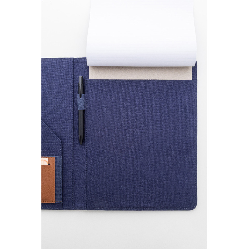 Porte-documents Capudo A4 bleu en canvas recyclé, doté de multiples poches pour organiser documents et accessoires lors de réunions, conférences ou déplacements professionnels. Adapté au format A4, il intègre un bloc-notes ligné de 20 pages.